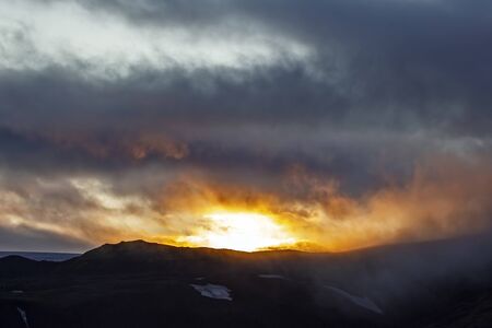 Sunset in mountain and misty terrain of Iceland. Nature and places for wonderful travels
