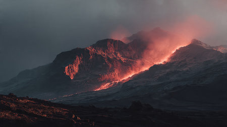 Fiery volcanic eruption with lava flows at night. Concept of active volcano, natural disaster, geological phenomenon, extreme environment.