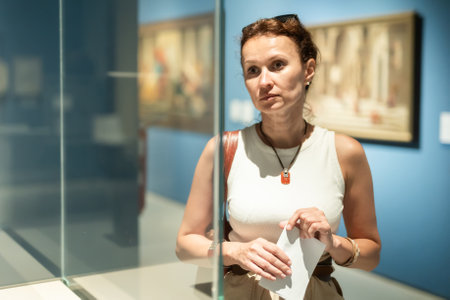 Portrait of pretty young woman visitor with paper guide at exhibition of paintings in museum