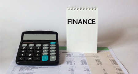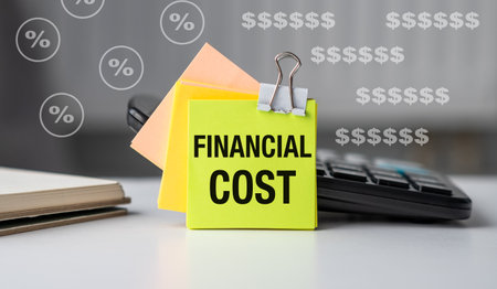 A yellow sticky note with the word financial cost written on it. The note is sitting on top of a calculator
