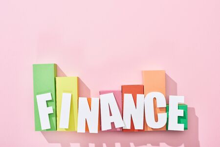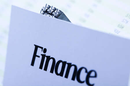 Word FINANCE formed by wood alphabet blocks on newspaper