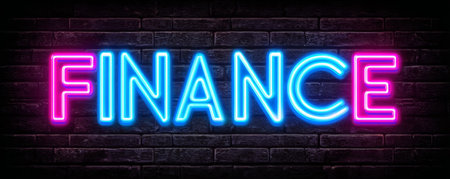 Finance word glowing neon sign with pink and blue light on dark brick wall background, bright colorful light effect