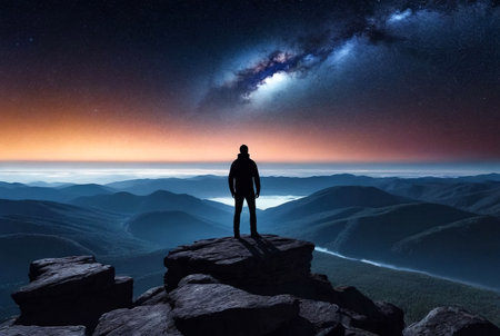 Silhouette of man standing on high rock at night sky with stars rise, nebula background. Perfect picture of night landscape. Fairy tale cosmic concept. Copy ad text space. Generative Ai illustration