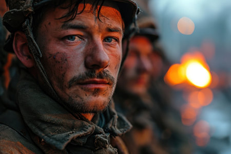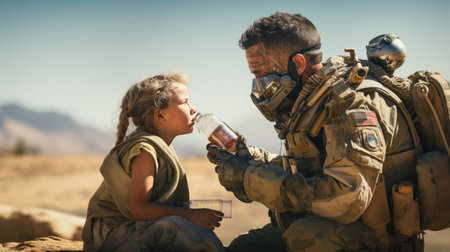 Captivating image: A little ethnic boy sips fresh water near a military brave man in a desert refugee camp. Capture the essence of humanitarian cooperation