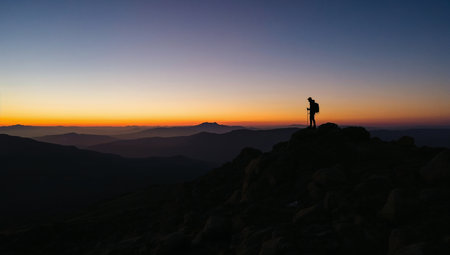 A lone hiker stands silhouetted on a rocky summit during sunset. The expansive, layered mountain range stretches toward the horizon under a gradient sky shifting from warm orange to deep blue, evoking solitude, exploration, and achievement. This dramatic landscape is ideal for outdoor, travel, adventure, and motivation campaigns.