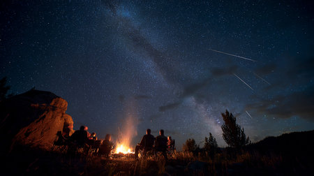 Silhouettes of friends sitting around campfire under night sky full of stars and milky way