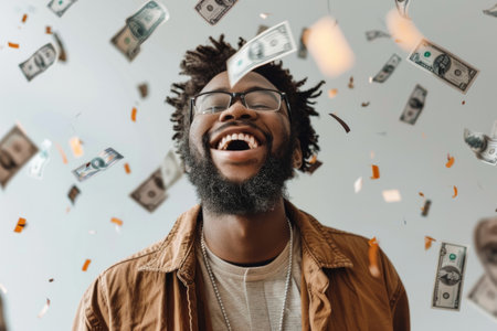 Happy person getting bonus money and banknotes flying in the air and get lucky rich and financial freedom comeliness