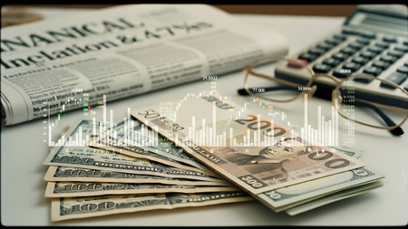 A stack of US dollar bills, coins, and a calculator on a table with a smartphone displaying a stock chart in the background of a bustling indoor setting.