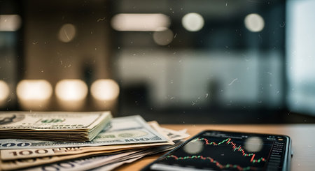 A stack of US dollar bills and a smartphone with a stock market graph on the screen