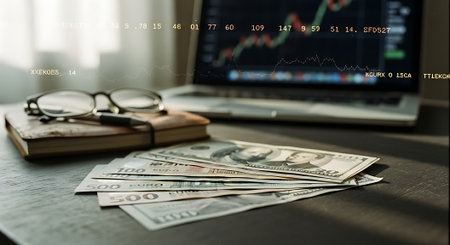 A stack of US dollar bills on a dark wooden desk with a laptop displaying a stock chart, a pair of glasses, and a book.