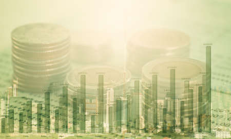 Double exposure of coins and column diagram with modern city background, Finance and banking concept