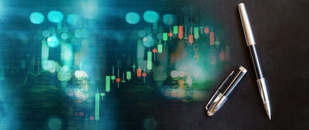 elegant black sign pen with blue city street light and index number and graph of stock market business abstract background