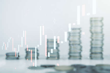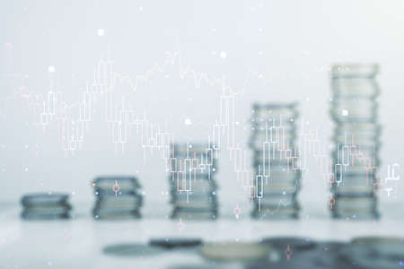 Abstract virtual financial graph hologram on stacks of coins background, forex and investment concept. Multiexposure