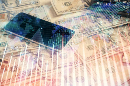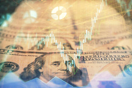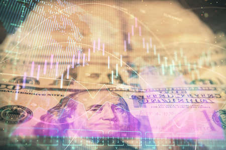 Multi exposure of forex chart drawing over us dollars bill background. Concept of financial success markets.