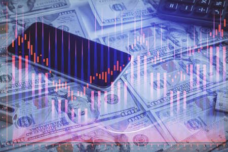 Double exposure of forex graph drawing over us dollars bill background. Concept of financial markets.