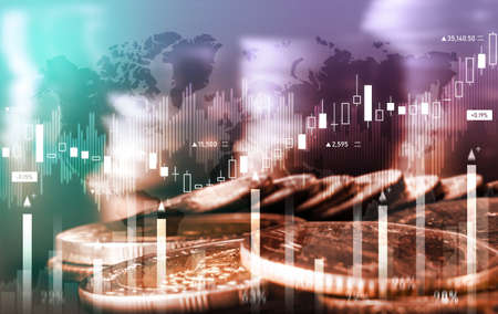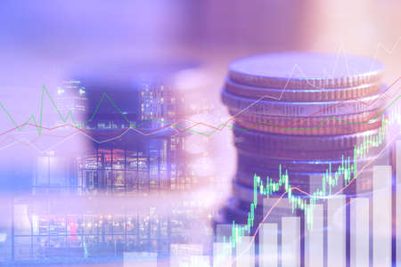 Financial investment concept, Double exposure of stack of coins and city for finance investor, Forex trading market candlestick chart, Cryptocurrency Digital economy. investing growing.economy trends