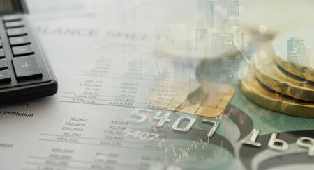 financing banking business accounting concept. financial figures report with calculator, credit card and money.