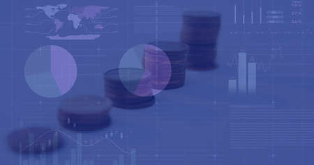 Image of financial data processing and statistics recording over stacks of coins. global finances and business concept digitally generated image.