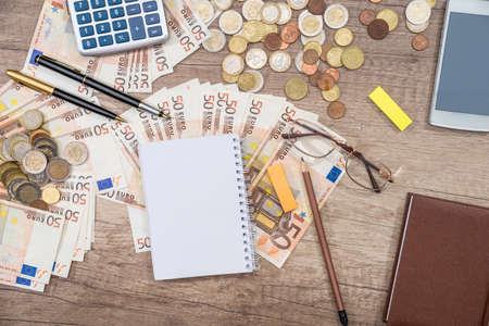notebook with notes and pen, paper money and coins on a light background
