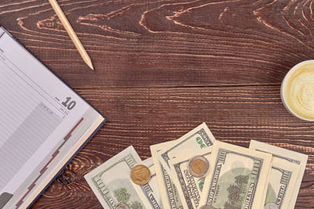 Accountant workplace with copyspace, top view. Money, notebook, pencil and cup of coffee.