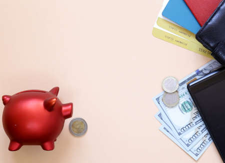 Calculating bills or taxes reports with with purse and bank cards, top view