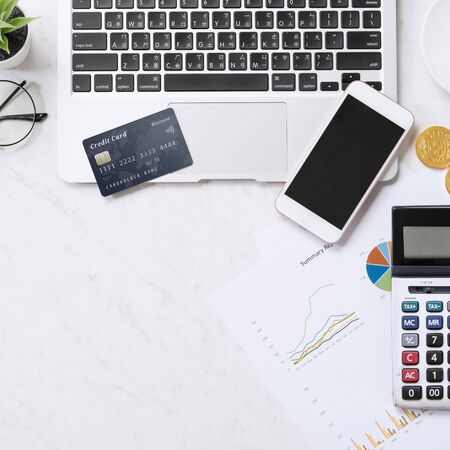 Concept of online payment with credit card with smart phone, laptop computer on office desk on clean bright marble table background, top view, flat lay