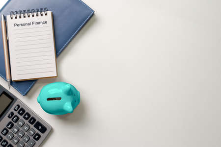 Notebook with text personal finance and pen, blue piggy bank, calculator, depict budget planning for basic needs, family, personal expense, Business and personal financial concept.