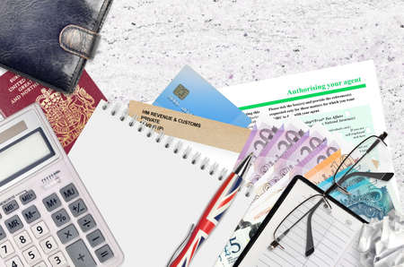 English form 64-8 Authorising your agent from HM revenue and customs lies on table with office items. HMRC paperwork and tax paying process in United Kingdom of Great Britain