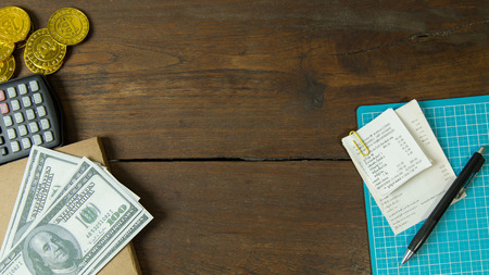 notebook, pen, calculator and money on the table, business concept