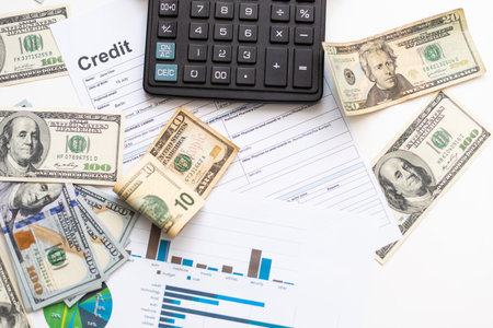 Utility or mortgage bills, calculator and US dollars - finance concept, payments and problems