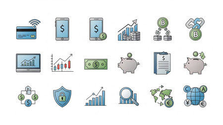 Digital banking and finance icon set representing investment, banking, and secure transactions