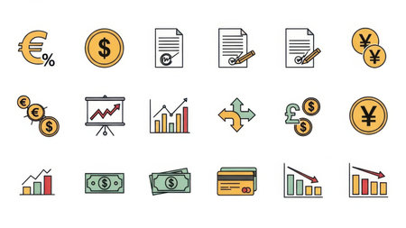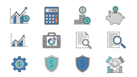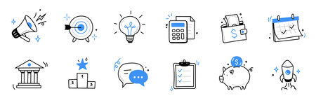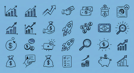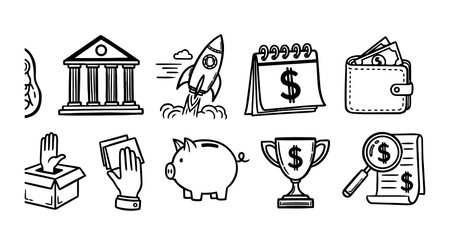 A collection of hand-drawn icons representing financial and business concepts, including money, investments, and success, presented clearly on a clean backdrop for easy integration into various projects and presentations.