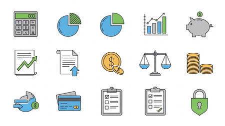 Flat design icons illustrating financial concepts such as calculators charts and secure payment methods