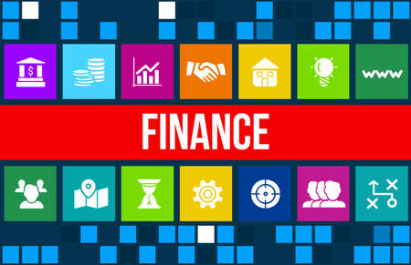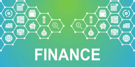 A collection of flat design icons representing financial concepts like credit cards, smartphones, graphs, currency, and security.