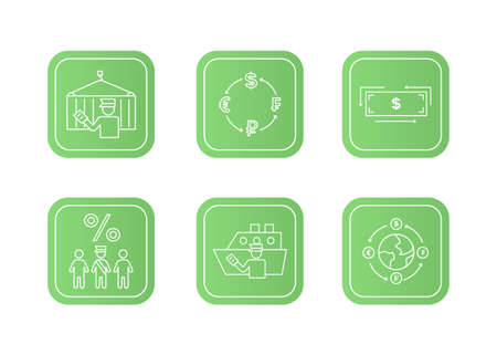 Finance icons. Financial services icons set. Icons customs broker, currency exchange. A silhouette of a man in the form of a customs broker with a document in hand near a cargo container on a hook.