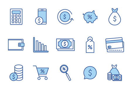 line and fill style icon set of money financial item banking commerce market payment buy currency accounting and invest theme Vector illustration