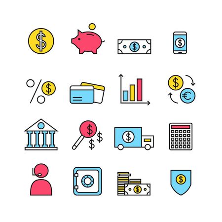 Finance icons isolated on background. Bank icons set. Money box, dollar, money exchange, mobile banking, credit card. Outline bank icons for web business. Flat line style vector illustration.