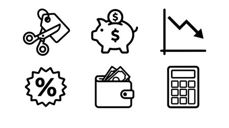 A clean minimal line vector displays six monochrome finance icons showing piggy bank wallet calculator downward chart percent badge and discount tag with scissors for business use professional