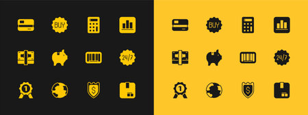 Set Pie chart infographic Worldwide Barcode Shield with dollar Piggy bank Calculator Credit card and Buy button icon. Vector.