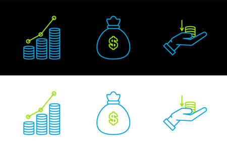 Set line Money on hand, Pie chart infographic coin and bag icon. Vector