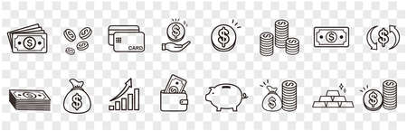Hand drawn business, money icon set. Finance, money, marketing sketch drawn cute trendy doodle icon. Business money, finance calculator, economic elements. Vector illustration