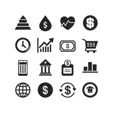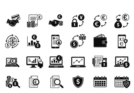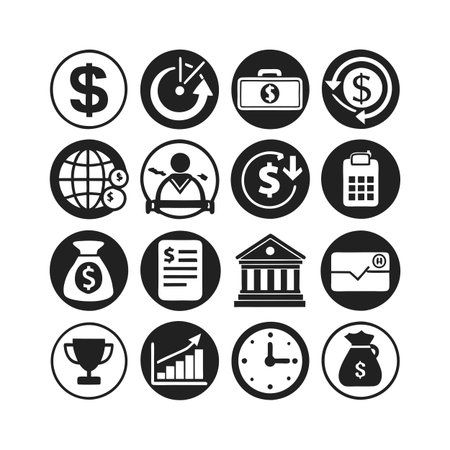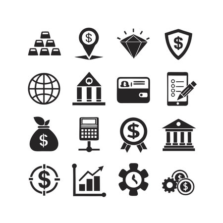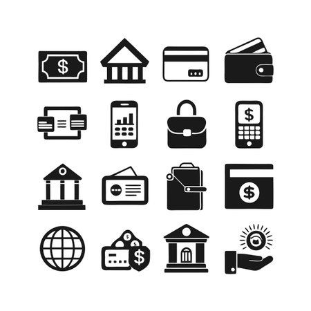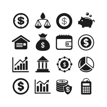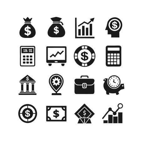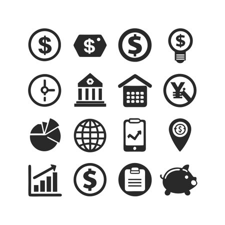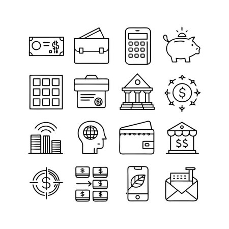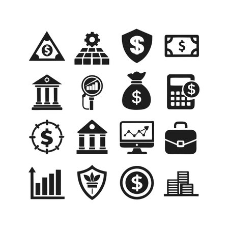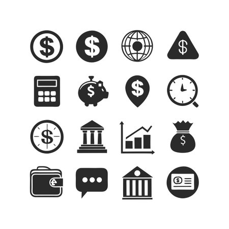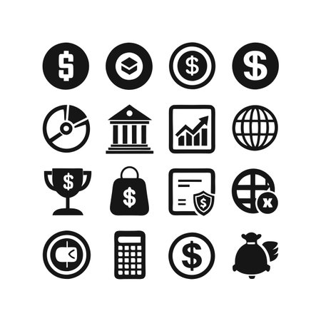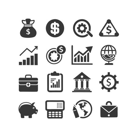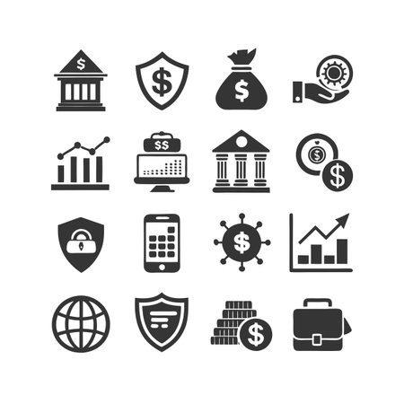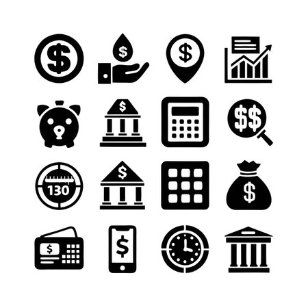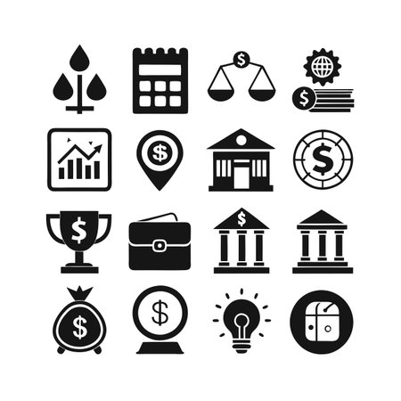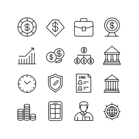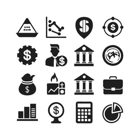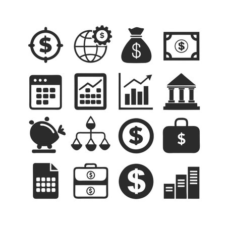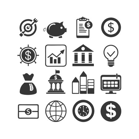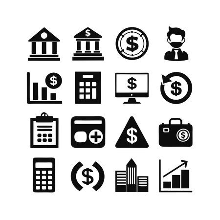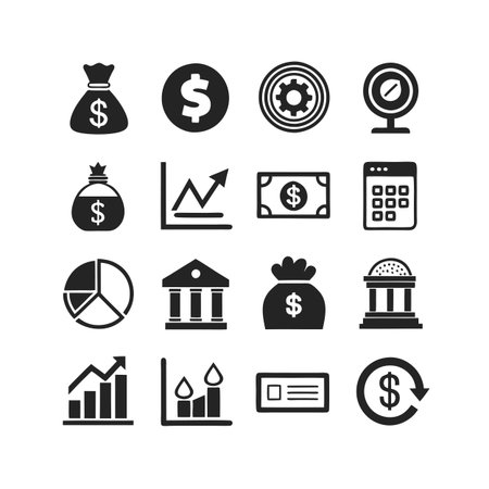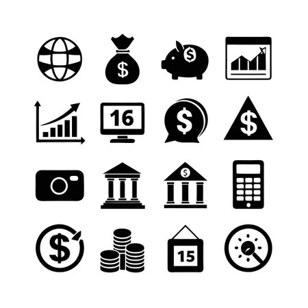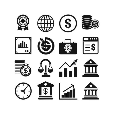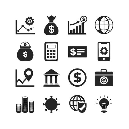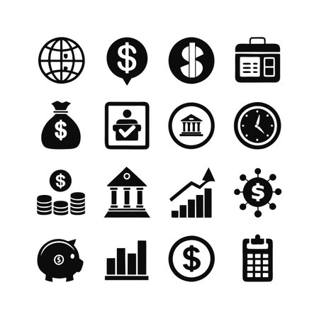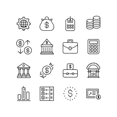 Financial Icons Grid: Banking, Investment, and Global Economics Concept Depicted in Black and White