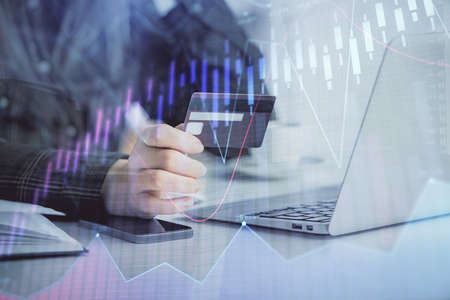Double exposure of man hands holding a credit card and Forex graph drawing. Stock trading and digital fintech in Internet E-commerce concept.