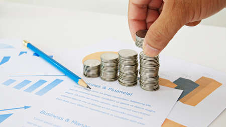 The hand of a businessman draws a line of coins with a pencil. The concept of economic growth.