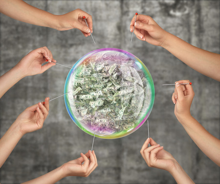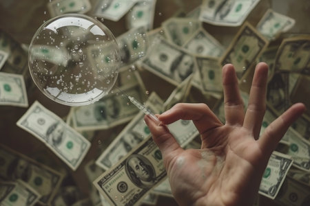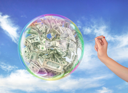 Hand bursting a soap bubble with a needle amid flying dollar bills symbolizing economic crisis