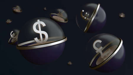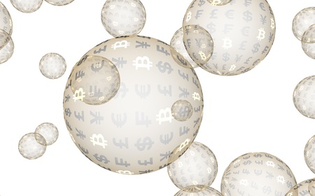 Multiple transparent, spherical objects are depicted floating in a bright, airy space. Each sphere contains a different currency symbol, such as the dollar ($), euro (