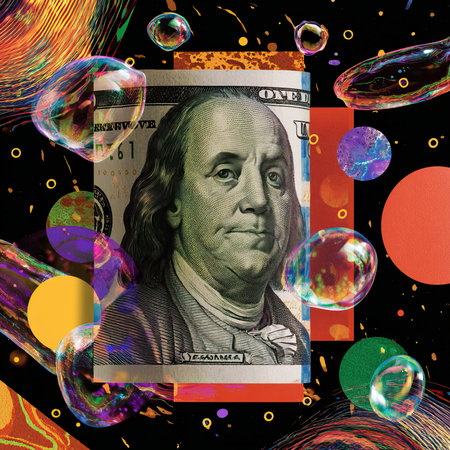 Benjamin franklin emerging from colorful soap bubbles and geometric shapes on one hundred dollar bill