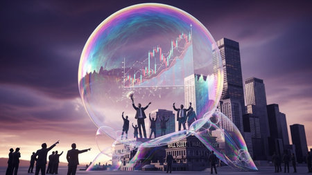 A bank reflected in a delicate bubble, depicting the fragile nature of the financial market. Generative AI