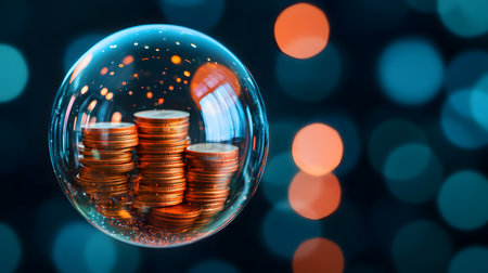 The image features a transparent bubble encapsulating stacked coins. The background displays colorful bokeh lights, creating an atmosphere of wealth and prosperity. It feels vibrant and inviting.