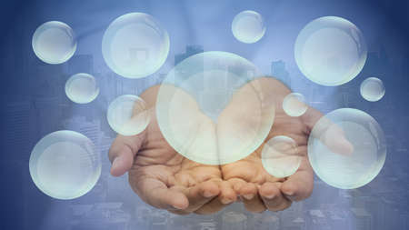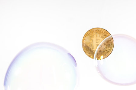 Soap bubbles covering bitcoins, representing the gradual burst of the blockchain bubble in bitcoin. Generative AI